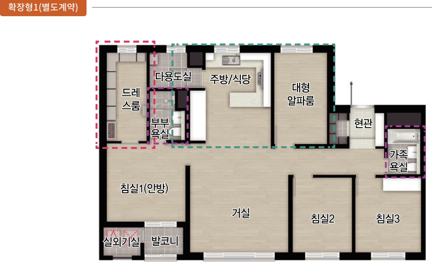 고덕자이 센트로 평면도입니다. 전 평형이 구 34평으로 84A, 84B로 이루어져 있습니다. 두 타입 모두 판상형이며 확장 선택시 두가지 확장타입이 있습니다. 먼저 84A를 보면 방4개, 화장실 2개인 구조입니다. 보통 확장을 많이 선택하시기 때문에 확장한 평면도로 설명을 드리겠습니다. 84A의 경우에는 현관에 들어오면 신발장과 펜트리가 있습니다. 바로 왼쪽에는 가족욕실, 맞은편에는 작은 침실 2,3이 위치해 있습니다. 침실 3의 경우에는 붙박이 장이 제공됩니다. 침실2 맞은 편에는 알파룸이 있고 확장형 1, 확장형 2의 차이는 이 알파룸이라고 보시면 됩니다. 확장형 1의 경우는 펜트리를 없애고 대형 알파룸으로 선택하는 것입니다. 따라서 우리는 수납보다는 큰 알파룸이 필요하다고 생각하시면 확장형 1을 선택하시는 것이 좋다고 봅니다. 확장형 2는 대형 수납공간인 펜트리가 있습니다. 펜트리에는 작은 짐, 골프백, 캠핑 장비 등 큰 짐을 보관할 수 있어 수납에 아주 좋습니다. 현관에도 펜트리가 있지만 나는 수납공간이 더 필요하다고 생각하시면 확장형 2를 선택하시는 것을 추천드립니다. 주방은 판상형 타입으로 창이 있어 집안 환기에 아주 좋은 구조입니다. 주방 옆 다용도실이 있습니다. 안방에는 드레스룸이 크게 있어 기본적인 옷, 가방 등이 수납이 가능해 별도의 옷장은 크게 필요하지 않을거라 생각됩니다. 안방에는 샤워부스가 있는 화장실이 함께 있습니다. 확장을 선택하게 되면 안방에만 발코니가 있고 이곳에 실외실이 있게 됩니다.