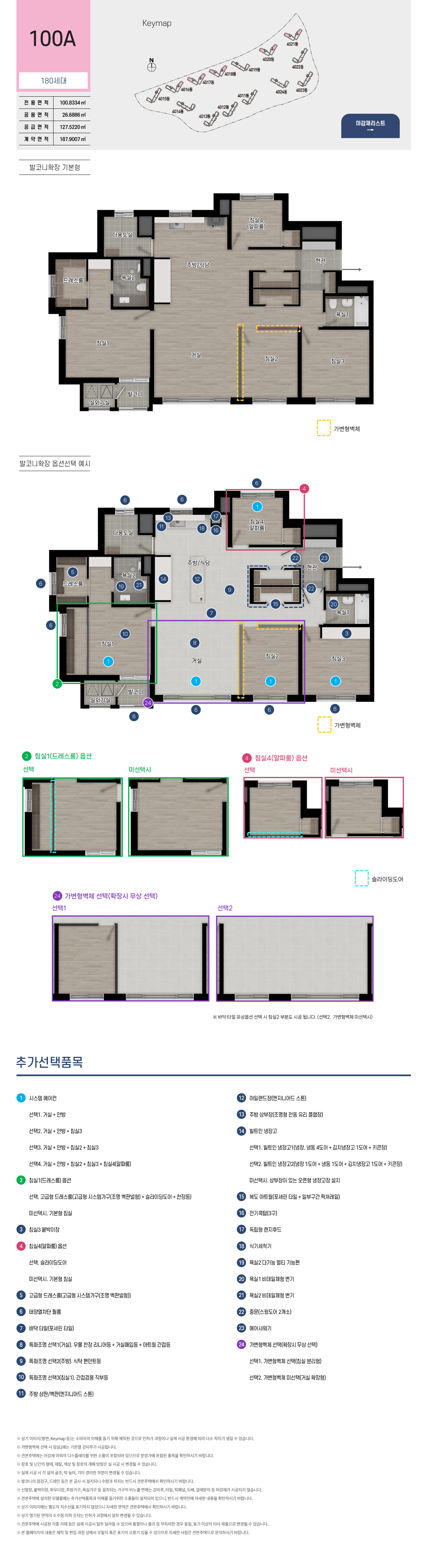 침실 1로 가보겠습니다 침실 1 앞에는 발코니와 실외기실이 있습니다. 84A 타입과 다르기 발코니 쪽 외에도 창문이 또 있습니다. 화장대와 드레스룸 구조도 조금 다릅니다. 드레스룸은 A타입보다는 더 정사각형 형태의 공간입니다. 침실4인 알파룸을 옵션선택해 드레스룸을 확장해 사용하실 수도 있고 별도의 펜트리 공간으로 사용도 가능합니다. 바닥을 포세린타일로 변경가능하고 중문, 빌트인 냉장고, 식기세척기 등 다양한 옵션을 선택할 수 있습니다. 옵션이 아주 다양해 아래 그림에 기재된 내용을 참고하시면 좋습니다.