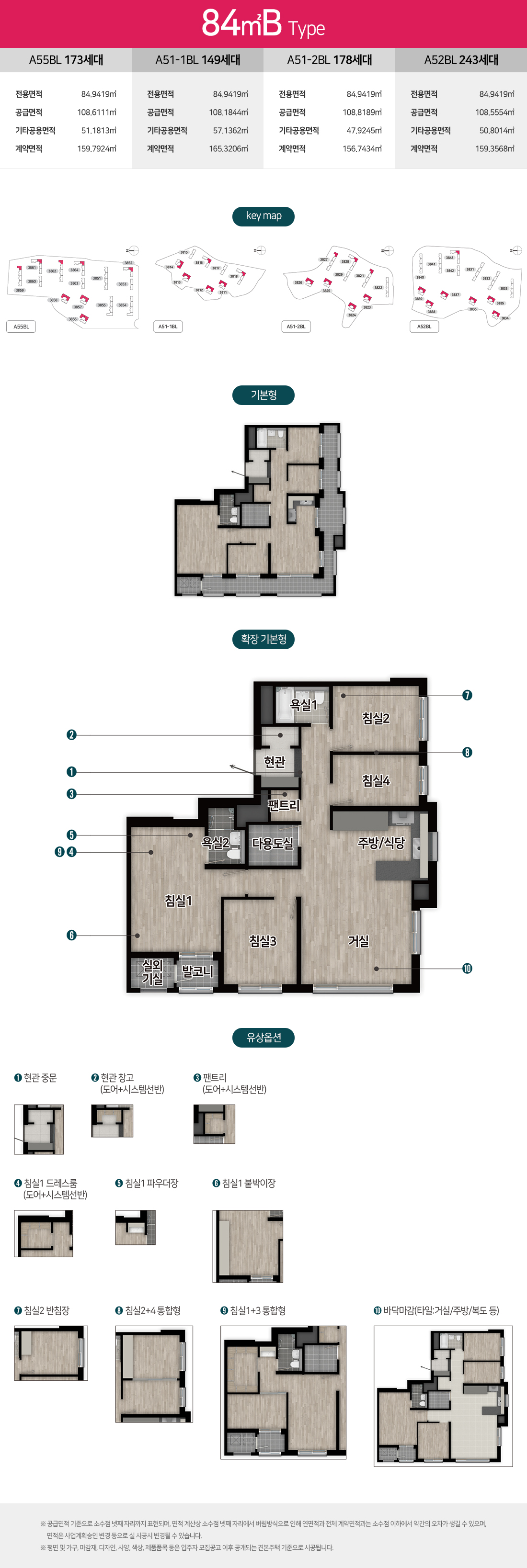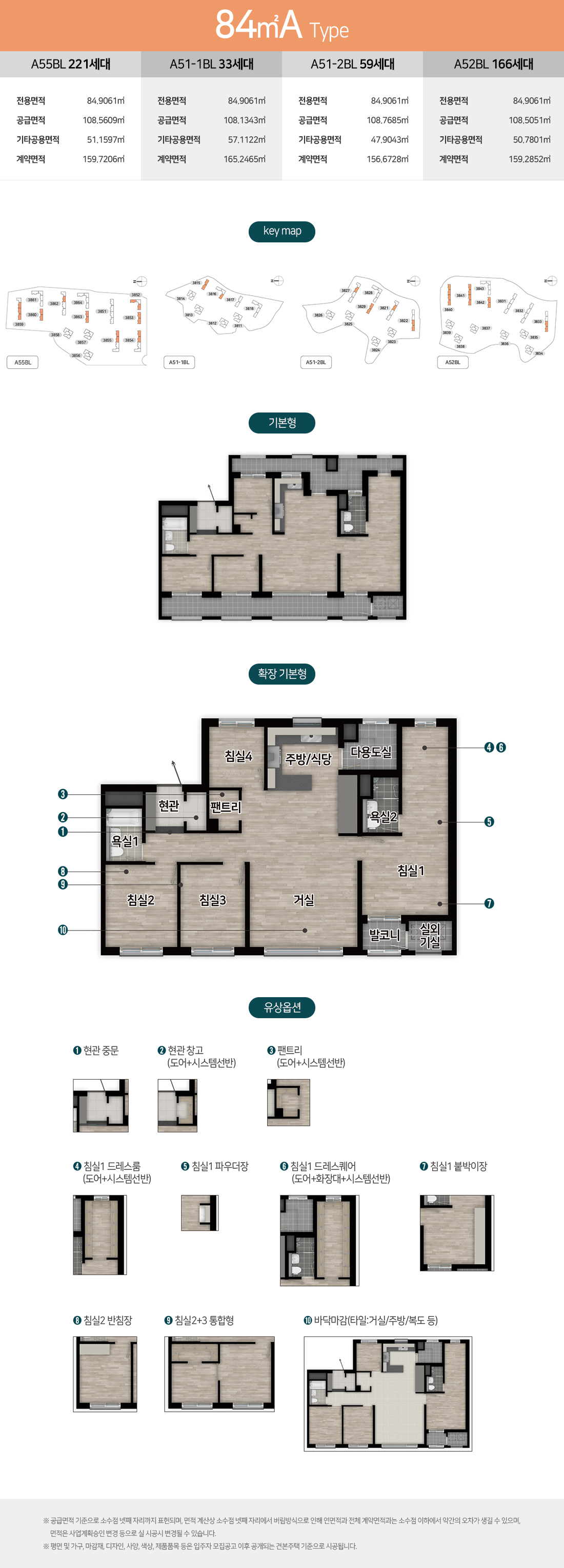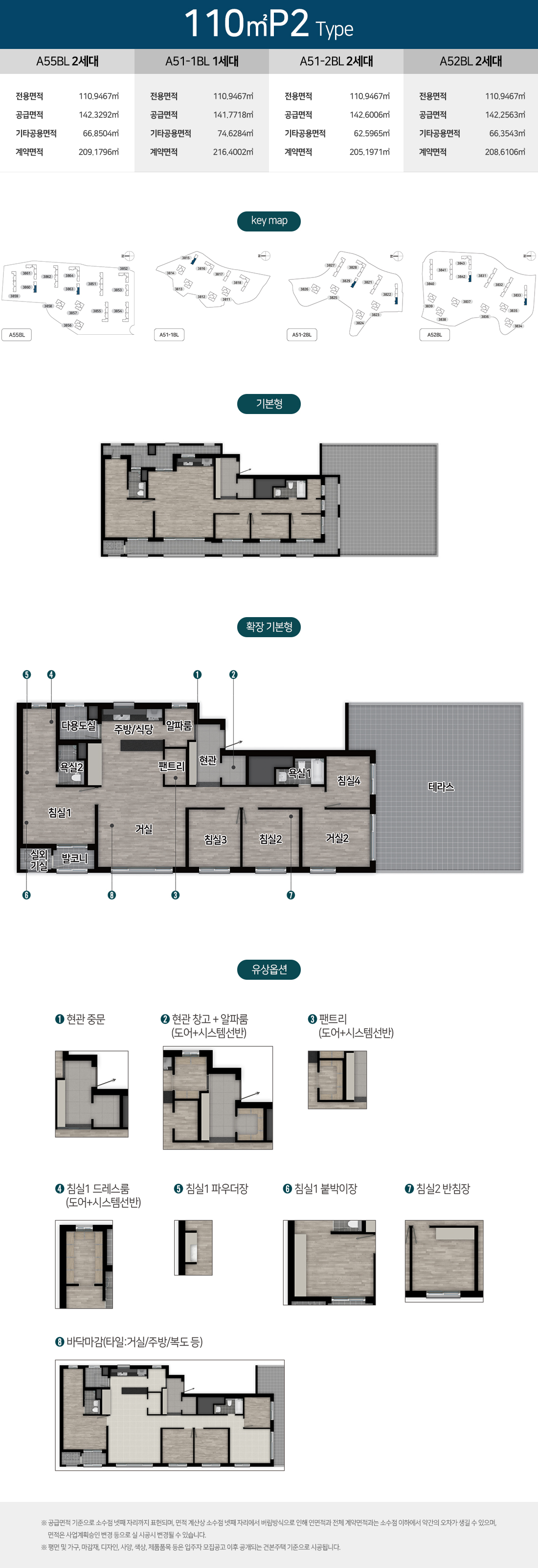 동탄 파크릭스 평면도입니다. 총 8가지 타입으로 구성되어 있습니다. 74, 84(A,B), 97(A,B,C), 110(A,P1,P2)으로 구성되어 있습니다. 대부분 기본형보다는 확장형으로 선택하는 경우가 많습니다. 따라서 평면도를 보실 때 확장기본형으로 보시면 도움되실 거라 생각됩니다. 또한 옵션의 경우에는 아래에 자세하게 기재되어 있으니 참고하시면 좋습니다. 동탄 파크릭스는 타입이 다양하여 자세한 내용은 다음 포스팅때 평면도만 다뤄보도록 하겠습니다.