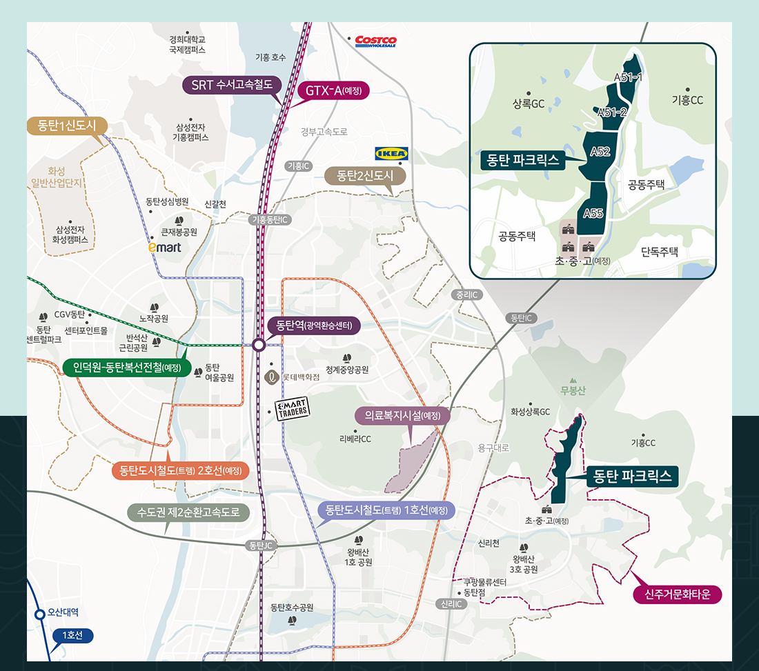 동탄 파크릭스 입지에 대해 설명드리겠습니다. 동탄 파크릭스 A55BL 앞으로 초등학교, 중학교, 고등학교가 예정입니다. 동탄물류단지와 쿠팡 물류센터가 근처에 있습니다. 동탄역 광역환승센터, SRT 수서고속철도, GTX-A(예정), 동탄도시철도 2호선(예정), 인덕원 동탄복선전철(예정)이 근거리에 있습니다. 수도권 제2순환고속도, 경부 고속도로 진입이 빨라 교통편이 편리합니다. 반석산근린공원, 동탄호수공원, 노작공원, 동탄여울공원, 청계중아공원 등이 근거리에 있어 푸른 숲과 수변을 품은 쾌적함 가득한 힐링단지입니다. 이케아, 코스트코, 롯데백화점, 이마트 트레이더스, 이마트, CGV 동탄, 센터포인트몰, 동탄성심병원 등이 있어 상권이 편리합니다. 삼성전자 화성캠퍼스, 삼성전자기픙캠퍼스가 있어 고급일자리가 있습니다.