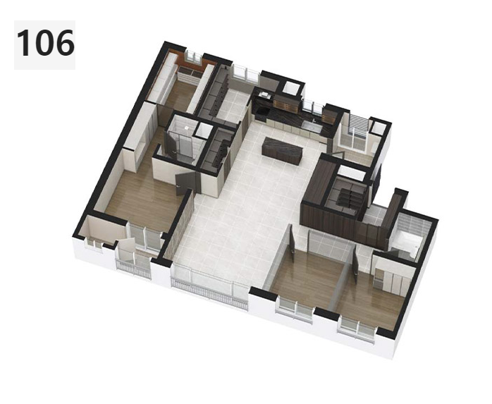 에코델타시티 대성베르힐 106 타입을 보겠습니다. 이는 구 41평 크기로 대형평수입니다. 판상형 3BAY 구조로 되어 있습니다. 현관에 들어오면 왼쪽에는 신발장, 오른쪽에는 대형 팬트리가 있습니다. 현관에 들어오면 작은 방이 2개가 있고 복도 끝에는 공용 화장실이 있습니다. 거실과 주방이 트여있어서 아주 넓어 보입니다. 주방에는 아일랜드장이 있습니다. 주방 옆으로는 팬트리와 알파룸정도 크기의 대형 펜트라기 있습니다. 맞은편에는 세탁공간으로 쓸 수 있는 다용도실이 있습니다. 106 타입과 106P 타입의 차이점은 안방입니다. 안방에 창문이 하나 더 있는 것이 차이가 납니다. 또한 드레스룸도 일자형과 ㄱ자 형태로 다르게 생겼습니다. 이 점이 두 타입이 눈에 띄게 보이는 큰 차이점입니다.