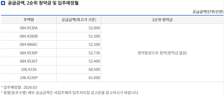 공급하는 주택형은 84A, 84B, 84B, 84P, 84T, 106, 106P로 총 7가지 타입이 있습니다. 84타입은 구 평형대로 33평 정도 되는 크기이고, 106 타입은 구 평형으로 41평 정도 되는 크기입니다. 따라서 부산 에코델타시티 대성베르힐은 중형, 대형 평형으로 공급하게 됩니다. 공급금액은 최고가 기준으로 84 타입은 약 5.2억이고 106 타입은 약 6억, 106P 타입은 약 6.1억입니다. 입주예정일은 2026년 3월입니다.