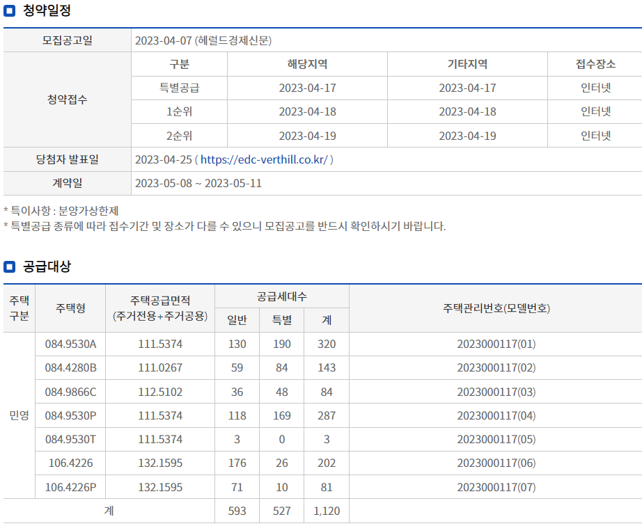 부산 에코델타시티 대성베르힐 17BL 청약 정보에 대해 알아보겠습니다. 공급위치는 부산광역시 강서구 강동동 에코델타시티 17BL입니다. 모집공고일은 2023년 4월 7일입니다. 청약접수는 특별공급 2023년 4월 17일, 1순위 공급 2023년 4월 18일, 2순위 공급 2023년 4월 19일입니다. 당첨자 발표일은 2023년 4월 25일입니다. 계약일은 2023년 5월 8일부터 2023년 5월 11까지입니다. 공급규모는 일반 공급 593세대, 특별 공급 527세대로 총 1120세대가 분양할 예정입니다. 특별공급은 다자녀가구, 신혼부부, 생애최초, 노부모 부양, 기관추천이 있습니다. 타입마다 다르기 때문에 본인이 원하는 타입과 내가 지원할 수 있는 특별 공급은 무엇인지 확인해 보는 것이 좋습니다.