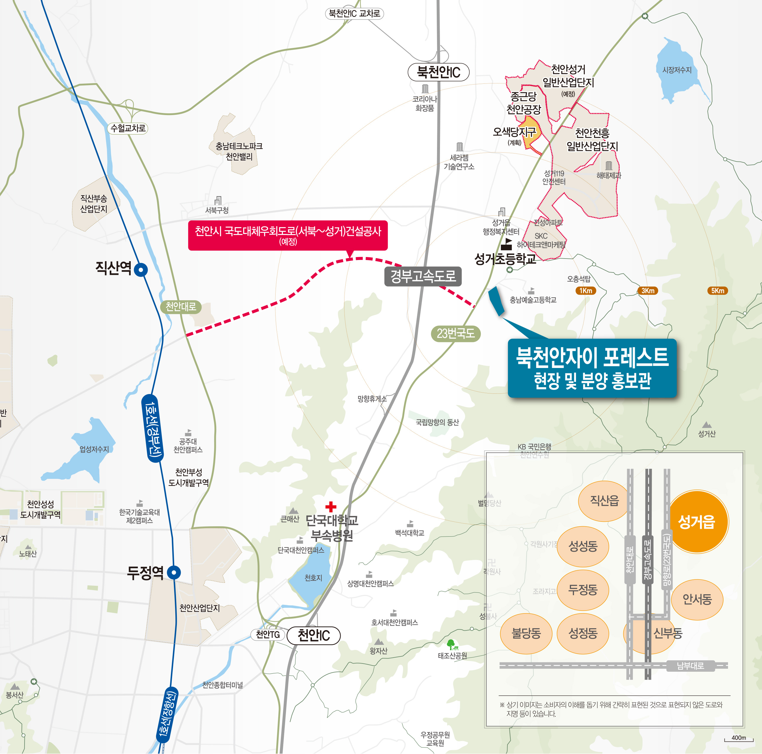 북천안자이 포레스트 입지에 대해 살펴보겠습니다. 북천안자이는 천안시 서북구 성거읍에 위치해 있습니다. 주변에 천흥산업잔지, 충남 테크노파크, 농축산물 물류센터, 천안 2,3,4 일반산업단지, 삼성 디스플레이, 삼성SDI, 안성 2,3,4 일반단지가 있습니다. 성거읍 주변에도 산업단지가 많아 일자리가 풍부하고 북천안자이 포레스트와 가까워 직주근접에 좋습니다. 북천안 IC, 천안 IC, 경부고속도로, 천안대로(1번 국도), 경부선 직산역, 두정역 1호선, 23번 지방도 망향로, KTX역 등 위치적으로 전국 어디로든 이동이 편한 교통망을 가지고 있습니다. 성거초등학교, 충남예술고등학교, 성거도서관, 단국대/상명대/호서대 천안캠퍼스, 백석대학교 등 주변 교육환경도 좋습니다. 성거산 등산로와 계곡, 각원사, 만일사, 천흥저수지 등 주변 자연환경이 풍부합니다.