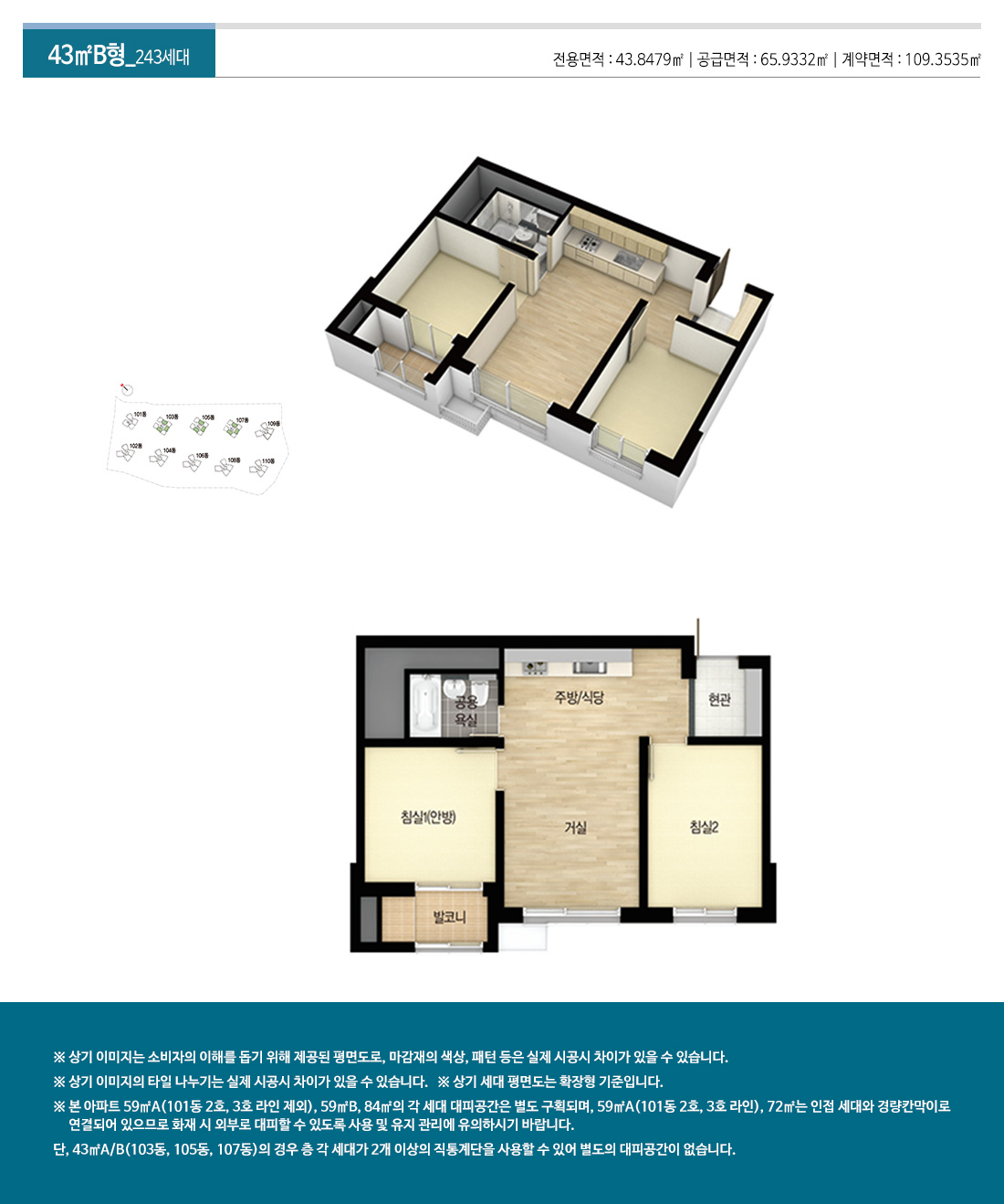43B 타입을 살펴보겠습니다. 현관에서 들어오면 왼족에 신발장이 있습니다. 현관에서 들어와 왼쪽에는 침실 2가 있습니다. 주방 겸 식당과 거실은 오픈형으로 되어 있습니다. 주방은 일자 싱크대로 되어 있고 옆에 냉장고 놓을 자리가 있습니다. 주방 옆으로는 공용 욕실이 있습니다. 공용욕실 옆으로는 안방으로 쓸 수 있는 침실 1이 있습니다. 침실 1에는 작은 발코니가 함께 있습니다. 세탁기 설치는 이 곳 발코니에 하시면 되리라 생각됩니다.