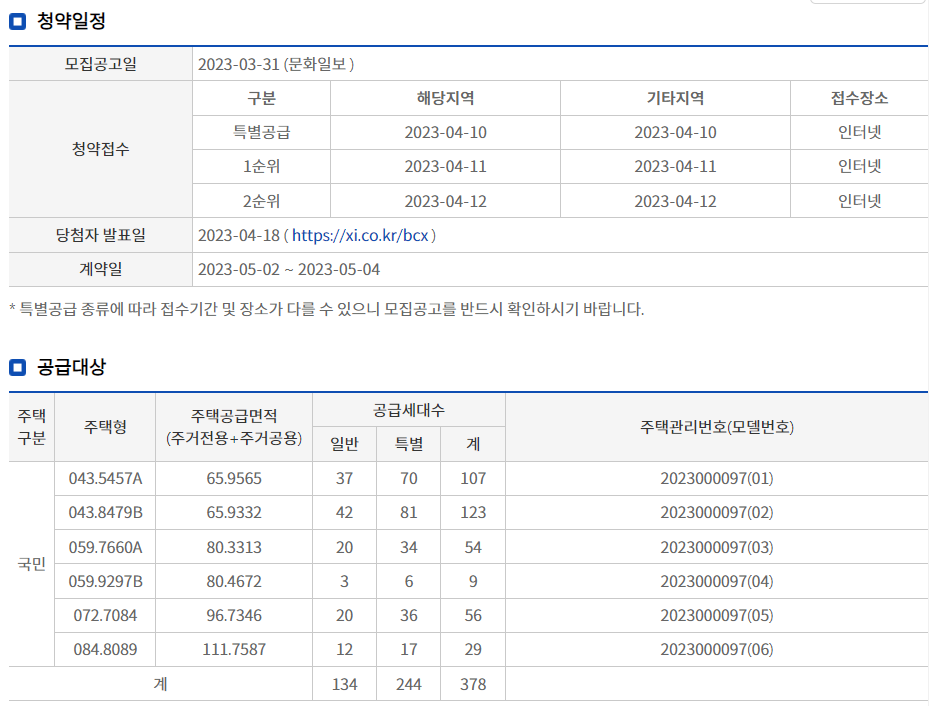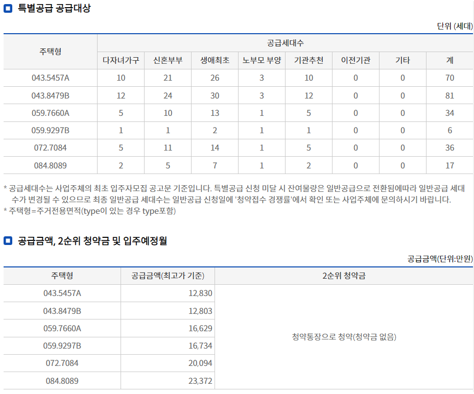 북천안자이 포레스트 청약 정보에 대해 알아보겠습니다. 우선 모집공고일은 23년 3월 31일입니다. 청약 접수 일정은 특별공급 23년 4월 10일, 1순위 23년 4월 11일, 2순위 23년 4월 12일 입니다. 당첨자 발표일은 23년 4월 18일, 계약일 23년 5월 2일부터 23년 5월 4일입니다. 공급대상은 43A, 43B, 59A, 59B, 72, 84 타입이 있습니다. 총 134세대가 일반분양이고 244세대가 특별공급이라 총 378세대가 분양하게 됩니다. 총 세대수는 1,348세대이지만 이번 분양에서는 일부인 378세대가 분양하게 되는 것입니다. 특별공급에는 다자녀가구, 신혼부부, 생애최초, 노부모 부양, 기관추천이 있습니다. 공급금액은 최고가 기준 43A, 43B는 약 1.2억, 59A, 59B는 약 1.6억, 72타입은 약 2억, 84타입은 약 2.3억입니다. 입주에정일은 2023년 7월 입주입니다.