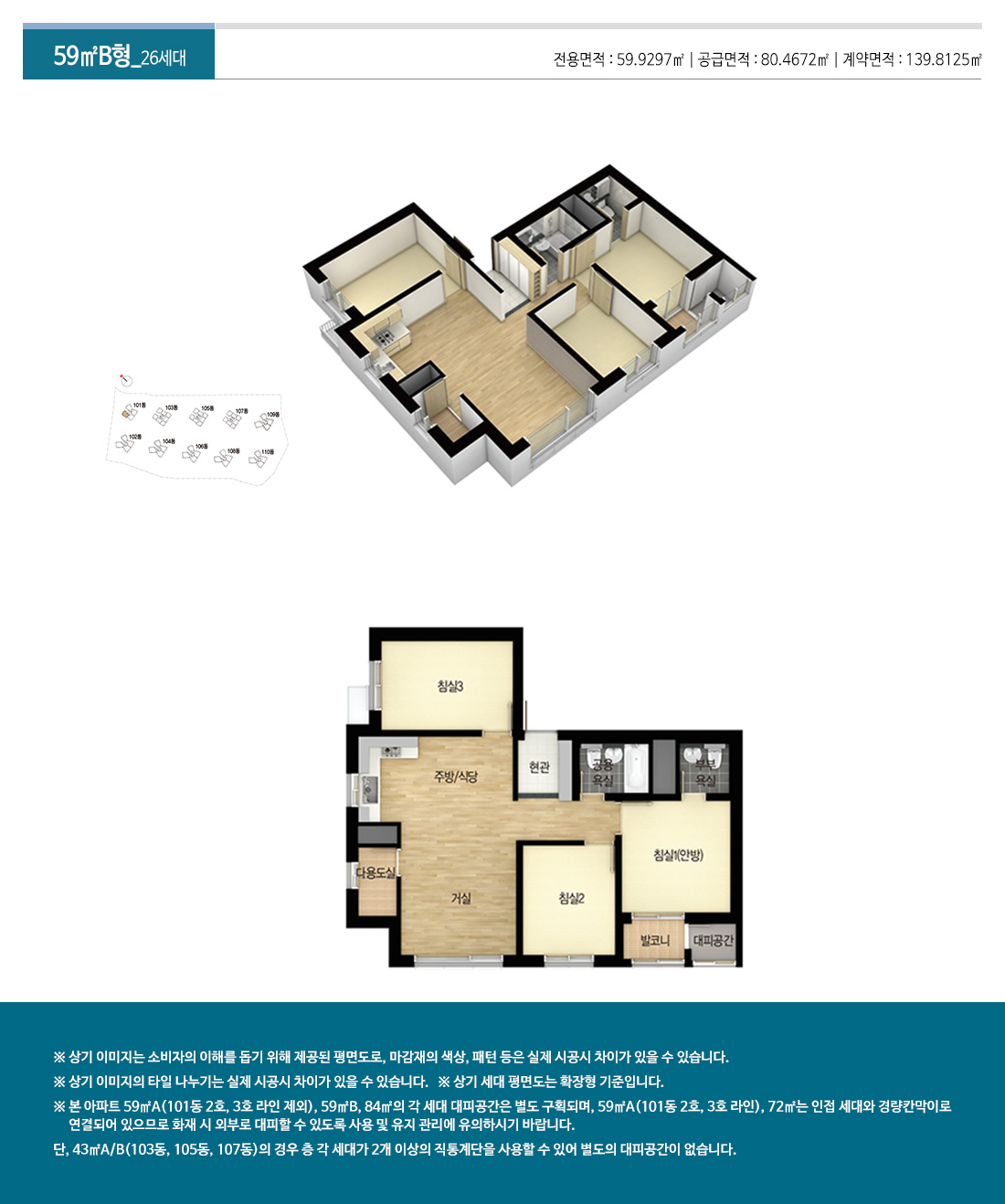 59B 타입에 대해 살펴보겠습니다. 현관에 들어오면 왼쪽에 신발장이 있습니다. 현관 왼쪽에는 욕조가 있는 공용 욕실이 있습니다. 욕실 맞은 편에는 침실 2가 있습니다. 그 옆으로 안방으로 쓸 수 있는 침실 1이 있습니다. 방에는 부부욕실과 발코니, 대피 공간이 있습니다. 복도를 나오시면 주방 겸 식당과 거실이 있습니다. 주방과 거실이 트여있어 넓어보일 거라 생각됩니다. 주방 싱크대는 ㄱ자로 되어 있습니다. 주방 옆에는 침실 3이 있습니다. 거실 옆에는 다용도실이 있어 세탁공간으로 쓸 수 있을 거라 생각됩니다.