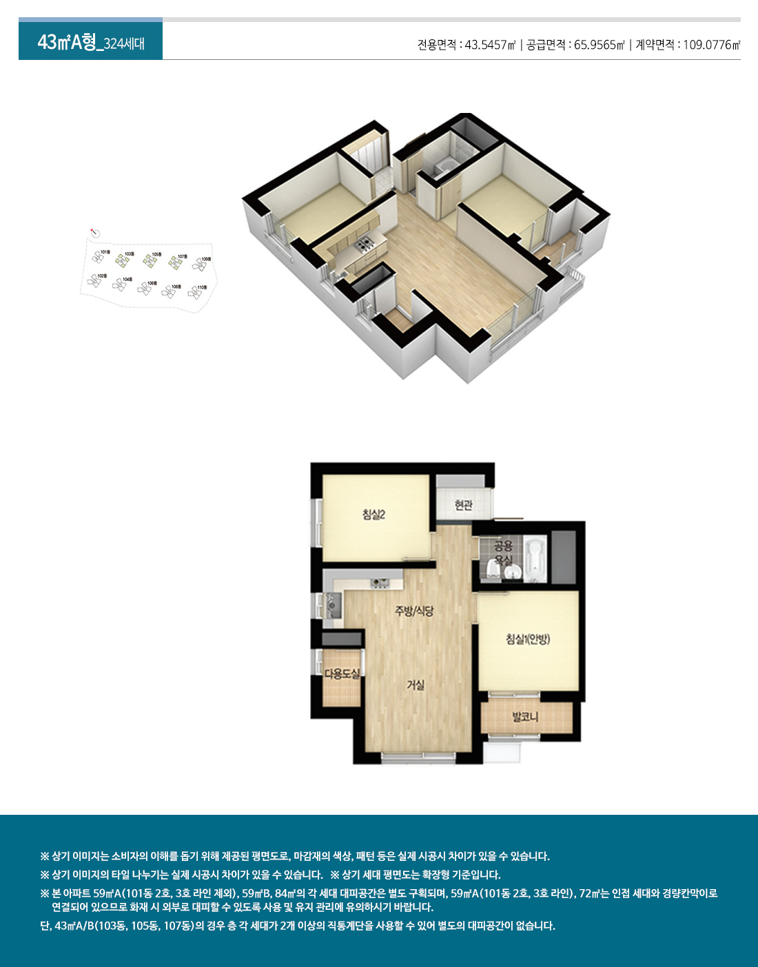 북천안자이 포레스트 평면도입니다. 북천안자이는 소형, 중형 평수로 구성되어 있습니다. 우선 43타입은 구 13평정도의 크기입니다. 우선 43A 타입에 대해 간단히 알아보겠습니다. 현관에 들어오면 오른쪽에 신발장이 있습니다. 현관에서 드러오면 왼쪽에 욕조가 있는 공용 욕실, 오른쪽에는 침실 2가 있습니다. 현관에서 더 들어오면 주방 겸 식당과 거실이 있습니다. 주방 싱크대는 ㄱ자 구조로 되어 있습니다. 주방 옆으로 다용도실이 있습니다. 맞은편에는 안방이 있고 안방 앞에는 작은 발코니가 있습니다. 소형평수이기 때문에 1인가구나 신혼 부부가 살면 좋은 크기입니다.