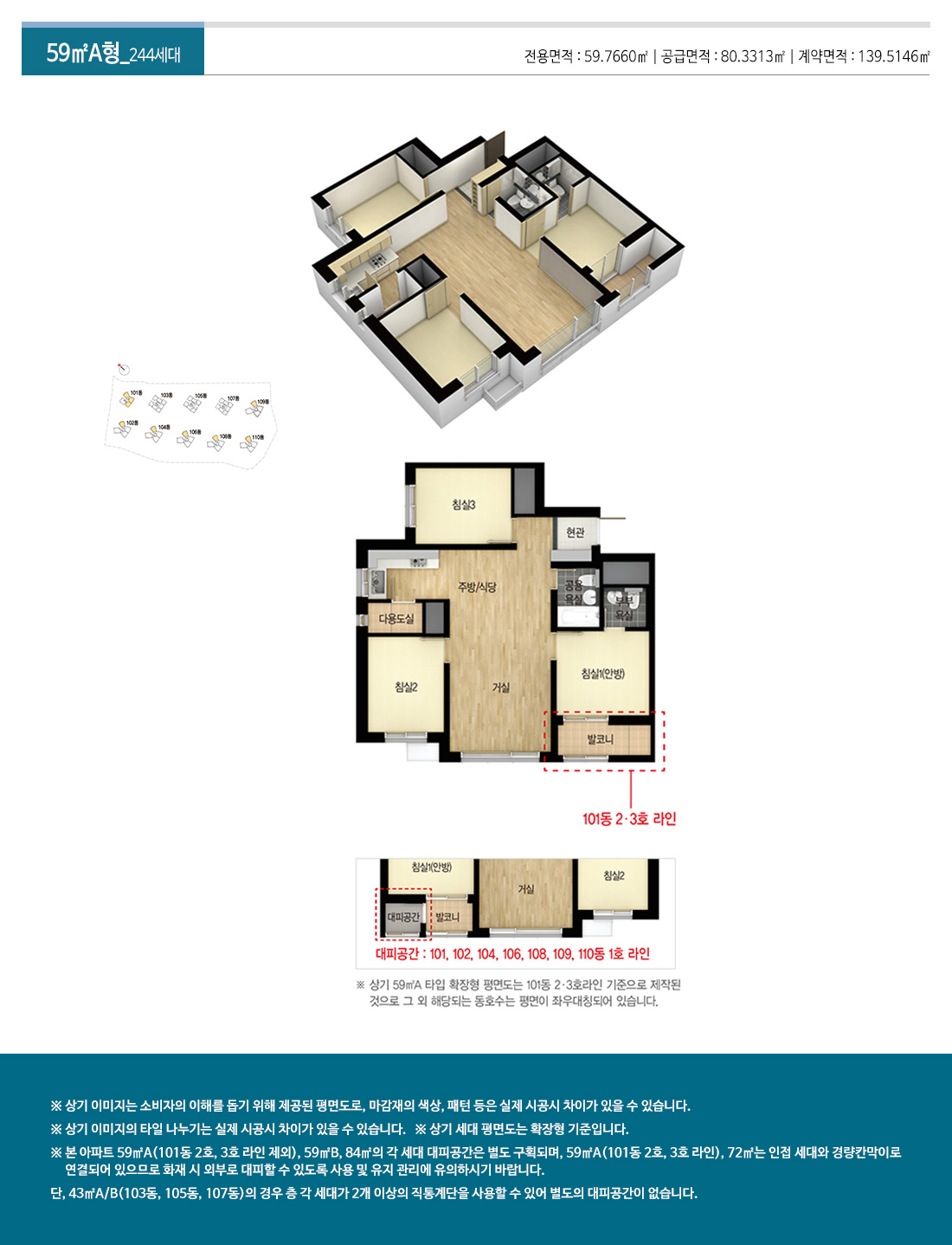 59A 타입에 대해 알아보겠습니다. 59타입은 보통 구 25평대입니다. 현관에 들어오면 왼쪽에 신발장이 있습니다. 현관 맞은 편에 침실 3이 있습니다. 현관에서 왼쪽으로 보시면 공용욕실이 있습니다. 공용욕실은 욕조가 있는 화장실입니다. 화장실 맞은 편으로 보시면 주방 겸 식당이 있습니다. 주방 옆으로는 다용도실이 있습니다. 거실 양쪽으로 침실 2와 침실1(안방)이 있습니다. 침실 1 안방에는 부부 욕실이 있습니다. 침실 1 앞에는 발코니가 있는데 이는 동호수에 따라 조금씩 다릅니다.