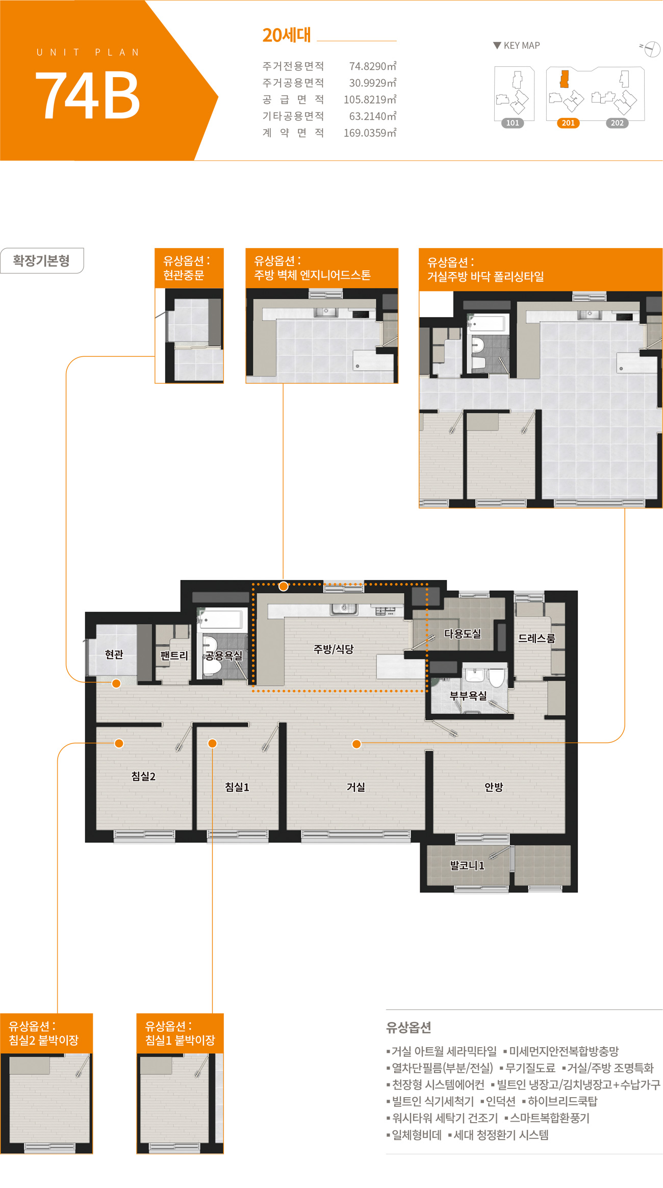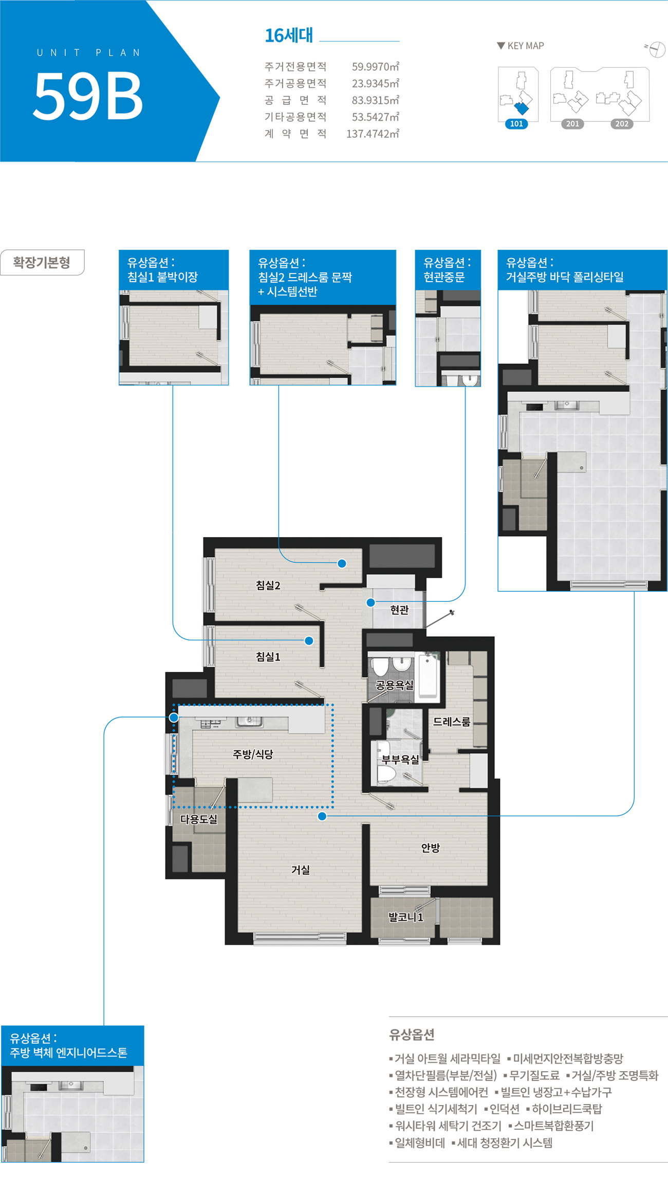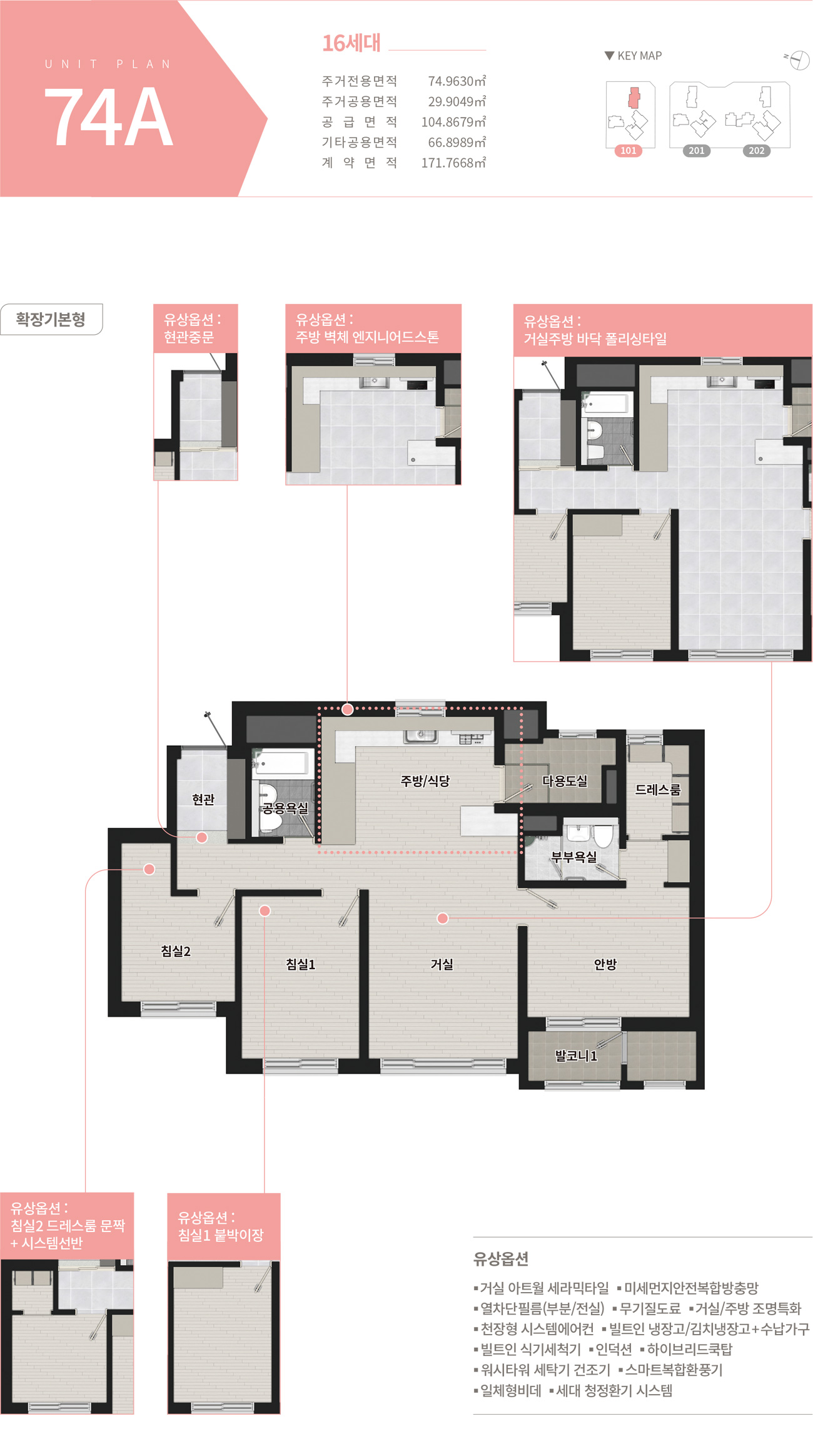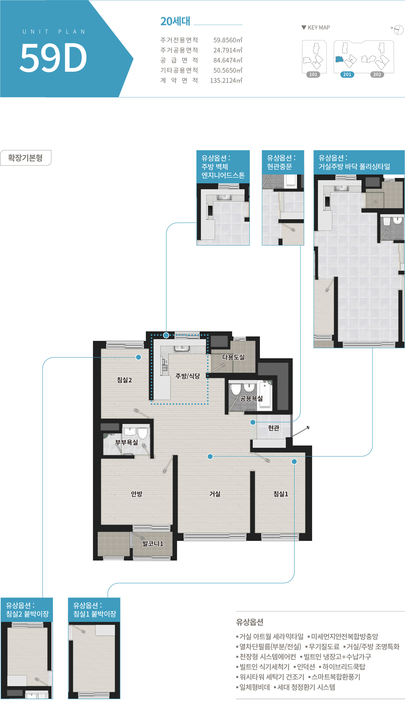 엘리프 미아역 평면도에 대해 알아보겠습니다. 우선 1단지의 경우에는 59A, 59B, 59C, 74A로 이루어져 있습니다. 구 25평과 30평정도의 평수라고 생각하시면 됩니다. 모두 방 3개, 화장실 2개로 이루어져 있고, 옵션 선택에 따라 붙박이장, 거실 복도 주방에 폴리싱타일, 주방 벽재 엔지니어드 스톤 선택이 가능합니다. 2단지의 경우에는 세대수가 좀 더 많은 만큼 평수도 더 다양합니다. 소형평수인 49A부터 84A까지 있습니다. 주로 구 25평인 59 타입과, 구 30평인 74 타입의 세대수가 가장 많습니다. 같은 평수이더라도 타입이 워낙 다양하기 때문에 본인의 라이프 스타일에 맞게 원하시는 타입을 잘 선택하시길 바랍니다.