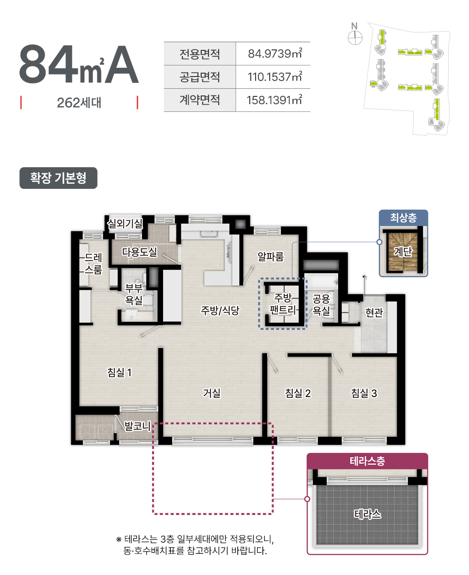 칸타빌 더 스위트 평면도에 대해 살펴보겠습니다. 구 33평 타입은 84는 총 4가지 평면도로 되어 있습니다. 세대수가 가장 많은 84A와 84B를 살펴 보겠습니다. 우선 84A는 총 262세대로 4BAY 판상형입니다. 방은 총 4개, 화장실 2개가 있습니다. 현관에 들어오면 침실 2, 침실 3이 있고 맞은편에 욕실이 있습니다. 주방에 들어오면 거실과 주방 겸 식당이 보입니다. 맞바람 치는 구조라서 환기에 좋습니다. 주방에는 주방펜트리가 있어 식자재나 생필품 등을 보관할 수 있습니다. 최상층은 주방 팬트리공간이 계단입니다. 주방 옆에는 알파룸이 있습니다. 반대쪽에는 다용도실이 있어 세탁공간으로 사용하시면 됩니다. 옆에는 실외기실입니다. 거실에는 테라스가 있는 세대가 있습니다. 3층 일부세대에 적용되니 동호수를 확인하셔야 합니다. 안방에는 부부욕실과 드레스룸이 크게 있어 옷, 가방, 액세서리 등을 수납할 수 있습니다.