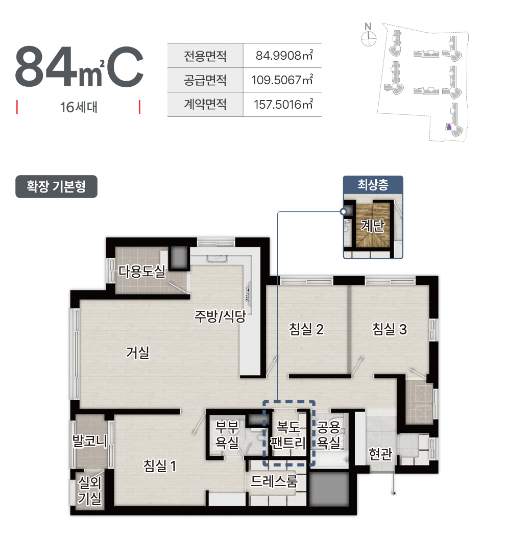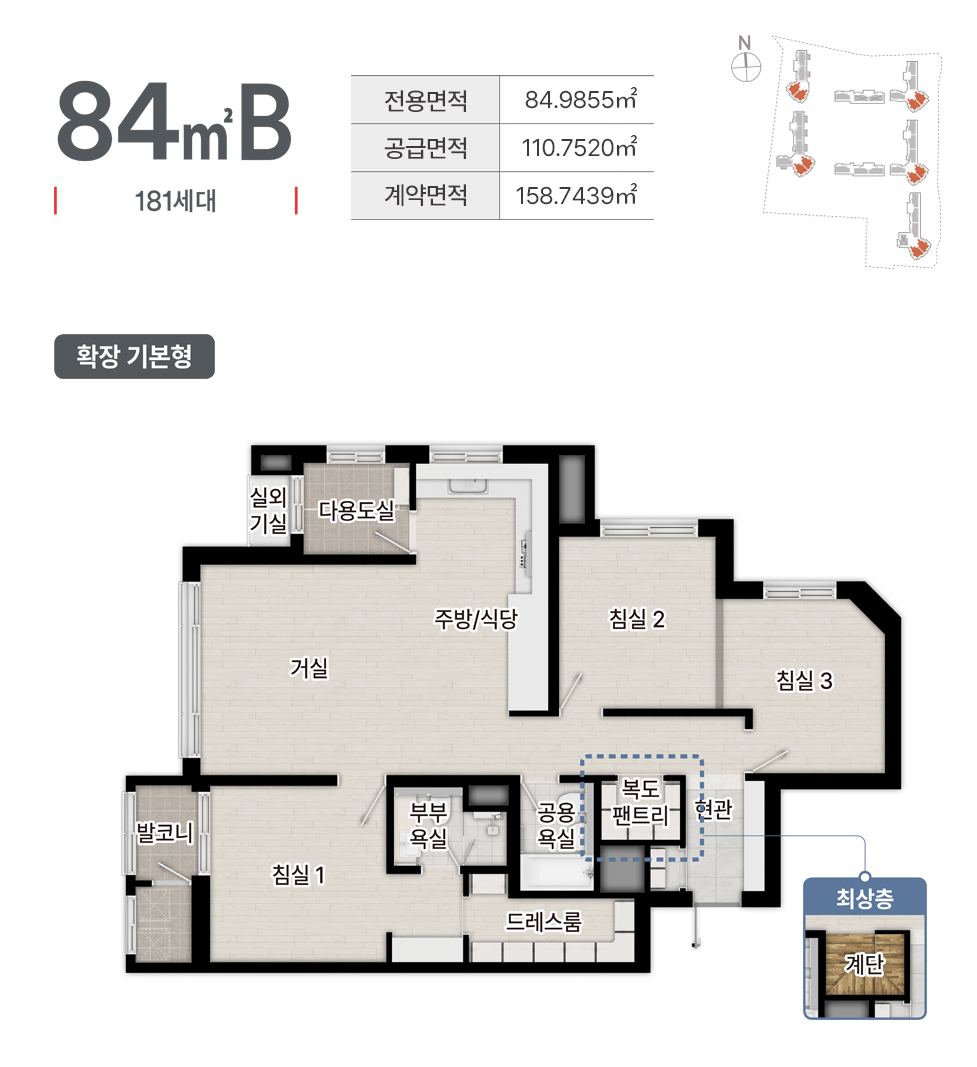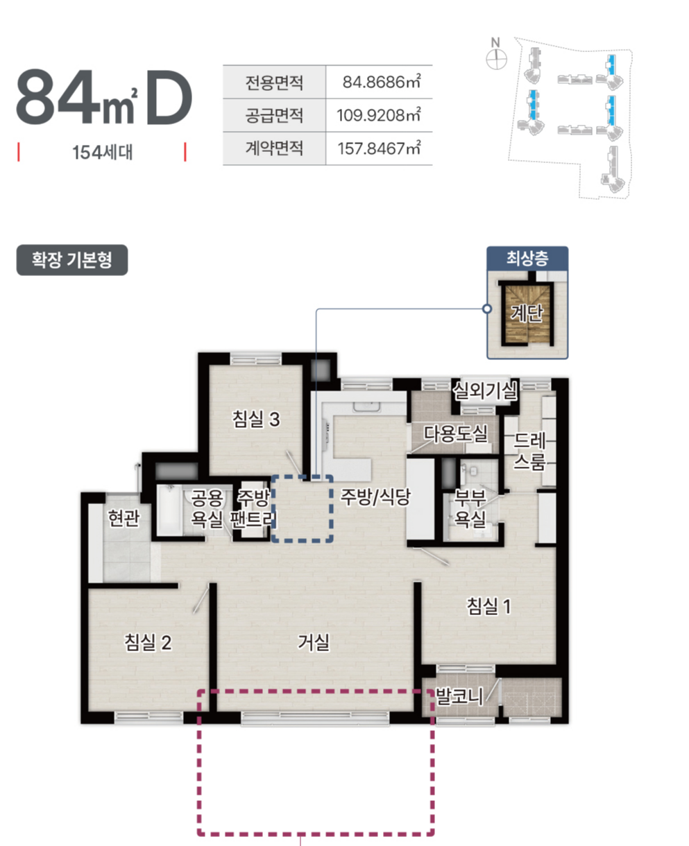 84B 타입은 타워형입니다. 현관에 들어오시면 현관이 길게 되어 있습니다. 오른쪽에는 신발장이 있습니다. 들어오면 오른쪽에 침실 3이 있습니다. 침실3은 다각형 모양의 방입니다. 바로 옆에 침실 2가 있고 맞은편에는 팬트리와 공용욕실이 있습니다. 주방으로 들어오면 주방이 크게 ㄱ 자 모양으로 되어 있습니다. 옆에 다용도실이 있어 세탁실로 사용하실 수 있습니다. 거실을 지나 침실 1을 보겠습니다. 발코니가 있고 안쪽으로 길게 부부욕실과 드레스룸이 있습니다. 안방에 드레스룸이 길게 있습니다. 작은 창문이 없어 환기가 조금 아쉽습니다. 탑층의 경우 복도 팬트리에 계단이 있어 위층 다락으로 올라갈 수 있습니다. 나머지 타입은 첨부된 평면도를 참고하시길 바랍니다.