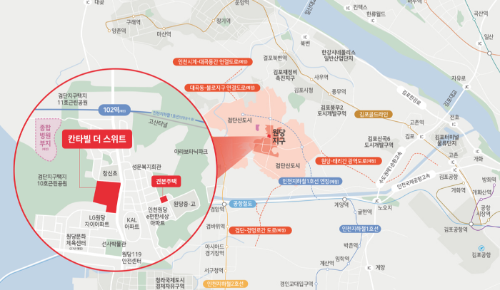 칸타빌 더스위트 입지에 대해 살펴보겠습니다. 인천 1호선 102역, GTX-D가 예정이고, 원당 - 태리 간 광역 교통망이 확충되어 서울로 빠른 교통편이 전망됩니다.바로 앞에 창신초와 유치원, 근거리에 원당중학교, 원당고등학교가 있어 주변 교육환경이 좋습니다. 검단지구 근린공원, 산들바람공원, 아라보타닉파크 등이 있어 주변 자연환경이 우수합니다. 롯데몰, 원당문화체육센터, 종합병원 등 여러 편의시설이 들어올 예정입니다. 또한 이미 주변에 아파트가 많아 기존 상권도 자리 잡혀 있어 당장 상권을 이용하는 데에 큰 불편함이 없을 거라 생각됩니다. 서울 업무지구 중 하나인 마곡이 근거리에 있어 직주근접도 만족시켜 줍니다.