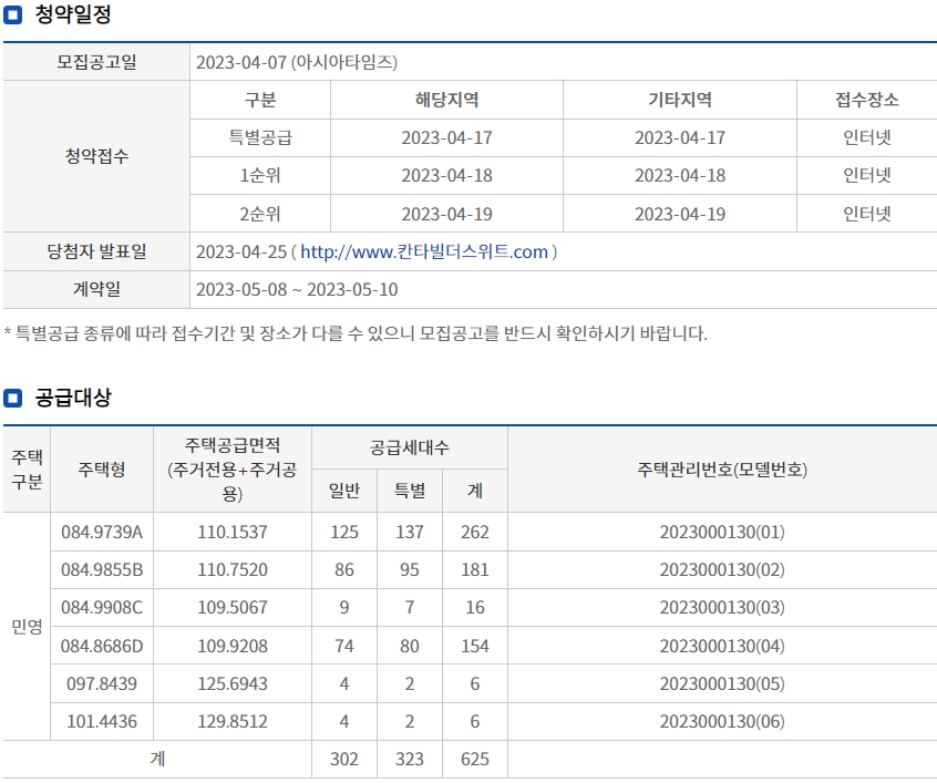 칸타빌 더스위트가 인천 서구 원당동 810-1번지 외 9필지에 들어옵니다. 공급규모는 총 625세대로 일반 공급 302세대, 특별공급 323세대가 있습니다. 모집공고일은 2023년 4월 7일입니다. 특별공급 2023년 4월 17일, 1순위 공급 2023년 4월 18일, 2순위 공급 4월 19일입니다. 당첨자 발표일은 2023년 4월 25일입니다. 계약일은 2023년 5월 8일부터 2023년 5월 10일입니다. 공급대상은 중대형으로 이루어져 있으며 84 타입이 A, B, C, D로 총 4가지이고, 97 타입, 101 타입이 있습니다. 일반 공급은 302세대, 특별공급 323세대로 총 625세대입니다. 특별공급은 84 타입 위주로 되어 있고 다자녀가구, 신혼부부, 생애최초, 노부모 부양, 기관추천이 있습니다. 97 타입과 101 타입은 다자녀 가구, 노부모 부양으로 아주 일부 세대만 공급됩니다. 공급금액은 84 타입 기준 약 6.3억, 97 타입 기준 약 5.58억, 101 타입 기준 약 5.68억입니다.
