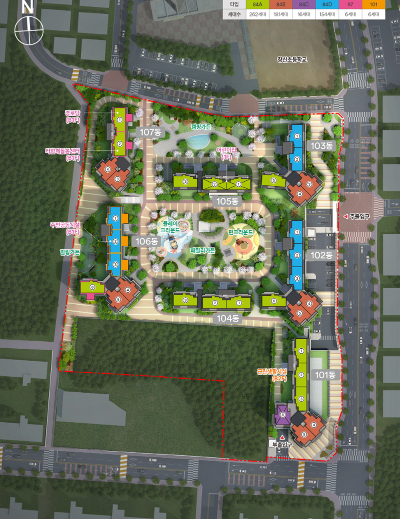 칸타빌 더스위트 단지배치도에 대해 알아보겠습니다. 칸타빌 더스위트는 중앙에 큰 광장이 있습니다. 플레이 그라운드, 패밀리 가든, 펀 그라운드가 있습니다. 공원에 있는 듯한 조경으로 잘 꾸며 놓아 입주민들이 산책을 하고 힐링을 하기에 좋은 공간입니다. 또한 바로 옆에 플레이 그라운드를 마련해 아이들이 마음껏 뛰어 놀 수 있습니다. 캠핑가든을 마련하여 입주민들이 편히 쉴 수 있습니다. 다함께 돌봄센터, 어린이집이 있어 자녀를 키우는 부모님들이 이용하실 수 있습니다. 그 외에 경로당, 힐링가든, 주민공동시설 등이 잘 마련되어 있습니다. 근린생활시설은 101동 옆에 위치해 있어 입주민들이 간단한 상권을 이용하시기 좋습니다.