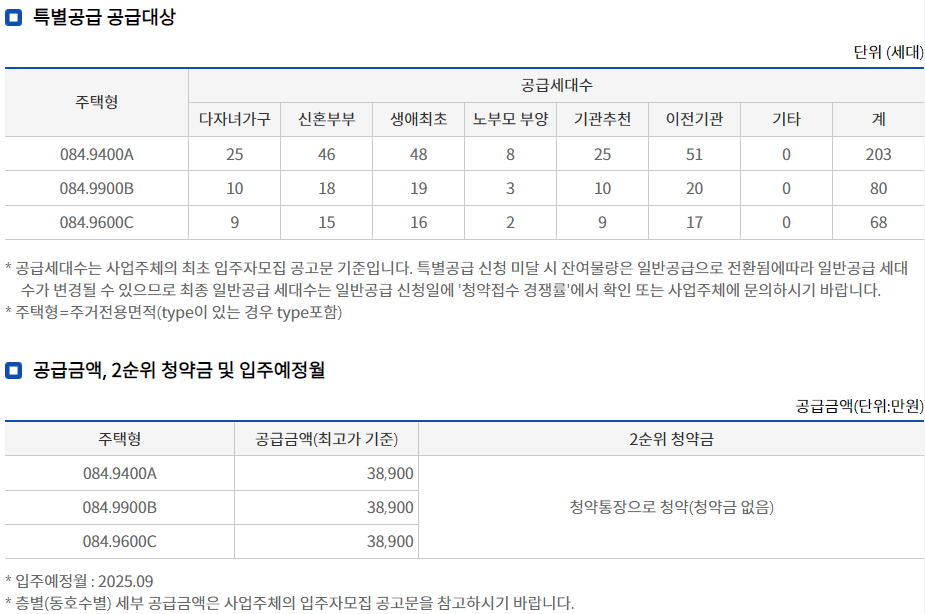 84B는 일반 20세대, 특별 80세대로 총 100세대입니다. 84C타입은 일반 17세대, 특별 68세대로 총 85세대가 공급됩니다. 일반공급 총 89세대, 특별공급 총 351세대로 총 공급 세대수는 440세대입니다. 일반공급보다는 특별공급의 비중이 많습니다. 특별공급은 다자녀가구, 신혼부부, 생애최초, 노부모 부양, 기관추천, 이전기관이 있습니다. 본인에게 맞는 특별공급 전형을 잘 파악해야 합니다. 공급금액은 최고가 기준으로 84 타입 모두 3.89억입니다. 입주예정일은 2025년 9월입니다.