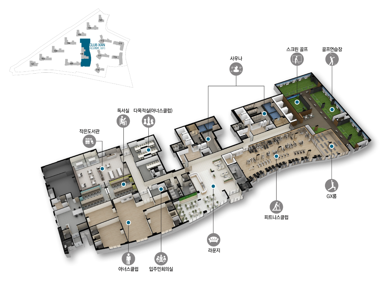 휘경자이 디센시아 커뮤니티에 대해 알아보도록 하겠습니다. 신축 대단지답게 커뮤니티 시설이 아주 잘 되어 있습니다. 활력 넘치는 생활을 위한 다양한 운동기구를 갖춘 피트니스 클럽, 단지 안에서 필드의 즐거움을 누릴 수 있는 입주민 전용 실내 골프 연습장, 건강과 아름다움을 유지할 수 있는 에어로빅, 요가 등이 가능한 GX룸, 힐링과 재충전을 위한 입욕시설을 갖춘 쾌적한 사우나, 조용하고 쾌적한 분위기의 입주민 전용 단지 내 학습공간인 작은도서관과 독서실, 입주민들이 모여 편안하게 휴식 및 담소를 나눌 수 있는 공간인 라운지가 있습니다. 이 모든 커뮤니티 시설을 단지 안에서 다 해결할 수 있으니 니 정말 장점이라고 볼 수 있겠습니다.