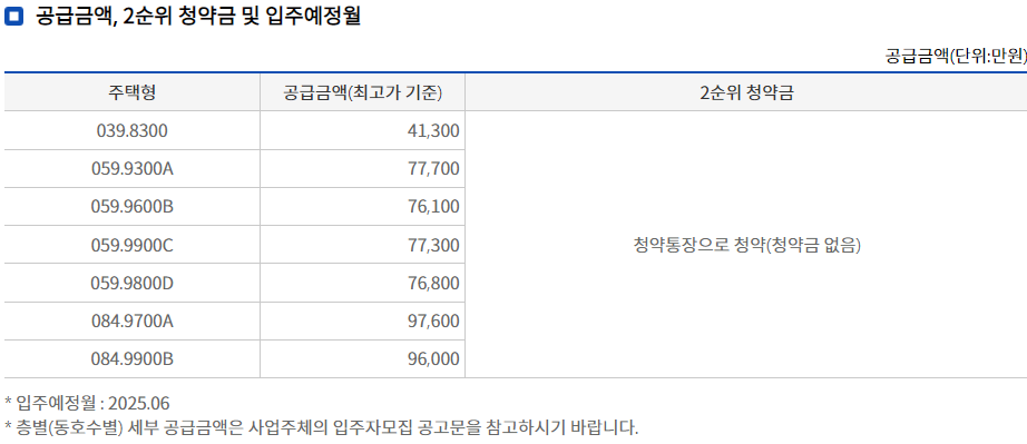 59B 타입은 일반공급 117세대, 특별공급 129세대로 총 246세대입니다. 59C타입은 일반공급 16세대, 특별공급 20세대로 총 36세대입니다. 59D 타입은 일반공급 118세대, 특별공급 129세대로 총 247세대입니다. 84A는 일반공급 12세대, 특별공급 16세대로 총 28세대입니다. 84B는 일반공급 20세대, 특별공급 25세대로 총 46세대 입니다. 특별공급은다자녀, 신혼부부, 생애최초, 노부모 부양, 기관 추천이 있습니다. 본인에게 해댕되는 특별공급이 있는지 확인하시길 바랍니다. 공급가는 최고가 기준으로 39타입은 4.1억, 59A 타입은 7.7억, 59B타입은 7.6억, 59C타입은 7.7억, 59D 타입은 7.6억, 84A 타입은 9.7억, 84B타입은 9.6.억입니다. 입주예정일은 25년 6월 입니다.