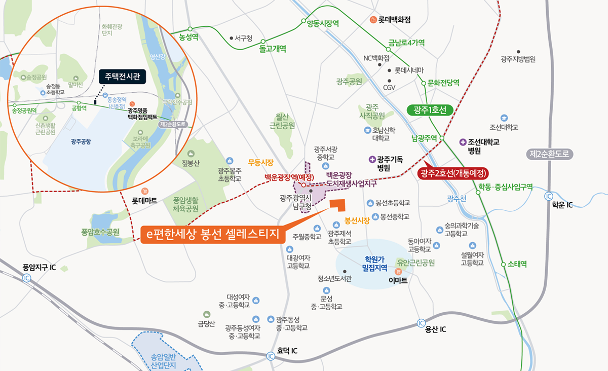 e편한세상 봉선 셀레스티지 입지에 대해 알아보겠습니다. 봉선동은 광주가 가장 선호하는 주거지입니다. 광주광역시에서 학군이 가장 좋아 아이를 가진 부모님이시라면 선호하는 지역 중 하나입니다. 또한 도보로 통학이 가능한 봉선초등학교, 봉선중학교, 광주제석초등학교, 주월 중학교 등 많은 학교들이 인접해 있습니다. 또한 근거리에 광주의 최대 학원 밀집지역이 있어 아이들 교육에도 도움이 됩니다. 주변에 남구문화정보도서관, 남구청소년도서관 등 공공 도서관이 주변에 있습니다. 또한 하나로마트, 이마트, 봉선시장이 주변에 있어 상권도 좋습니다. 근거리에 푸른길 공원, 봉선공원, 광주사직공원, 월산근린공원이 위치해 자연환경도 우수합니다. e편한세상 봉선 셀리지티에서 걸어서 10분정도 근거리에 광주도시철도 2호선 백운광장역이 26년에 개통을 앞두고 있습니다.또한 백운광장 도시재생 뉴딜 사업이 23년에 예정되어 있습니다.