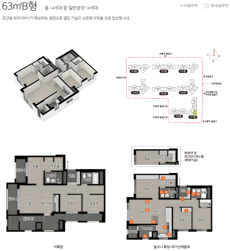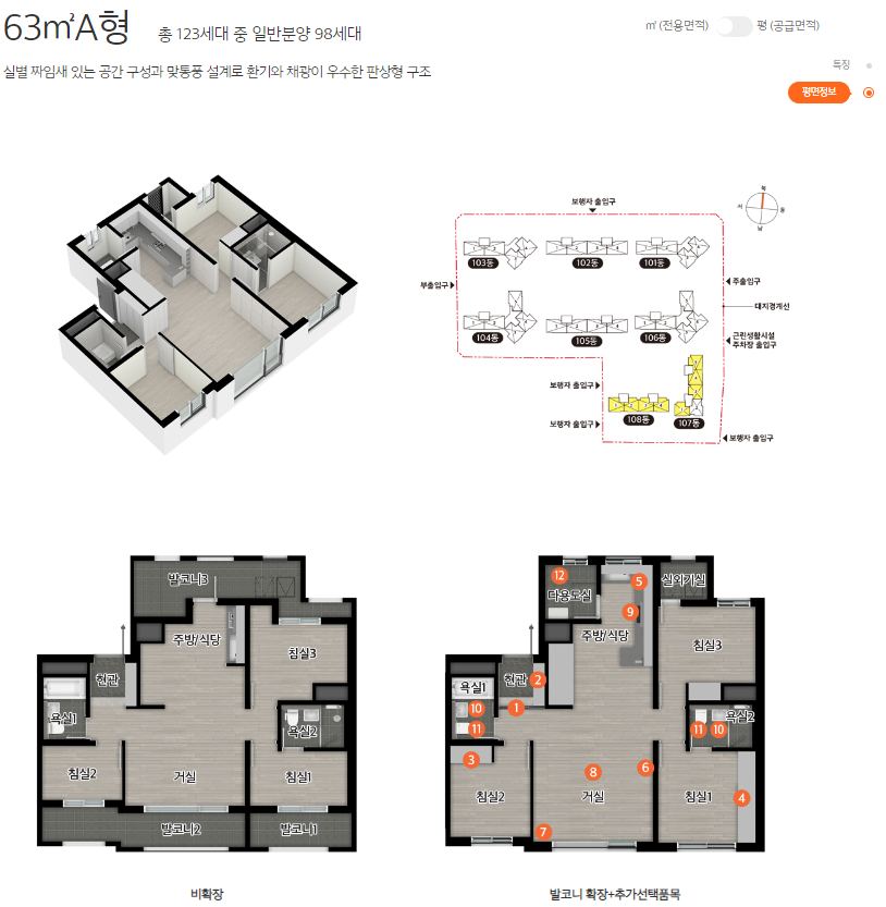 e편한세상 봉선 셀레스티지 평면도에 대해 알아보겠습니다. 대부분 확장을 많이 하시기 때문에 발코니 확장형 기준으로 구조 설명을 해드리겠습니다. 또한 추가 선택품목에 대해서도 함께 말씀드리겠습니다. 구 25평인 63A, 63B가 있고 구 33평인 84A, 84B가 있습니다. 먼저 63A에 대해 알아보겠습니다. 63A는 판상형 3BAY구조 입니다. 현관에 들어오시면 왼쪽에 신발장이 있습니다. 신발장은 오픈형 신발장입니다. 현관 중문도 선택해 설치하실 수 있습니다. 현관에 들어오면 오른족에는 욕실이 있는 형태의 화장실이 있습니다. 현관 맞은편에 침실 2가 있습니다. 침실2는 붙박이장을 선택해 설치할 수 있습니다. 다음 주방 겸 식당을 보시겠습니다. 주방에도 4인용 식탁이 충분히 들어갈 공간이 있습니다.